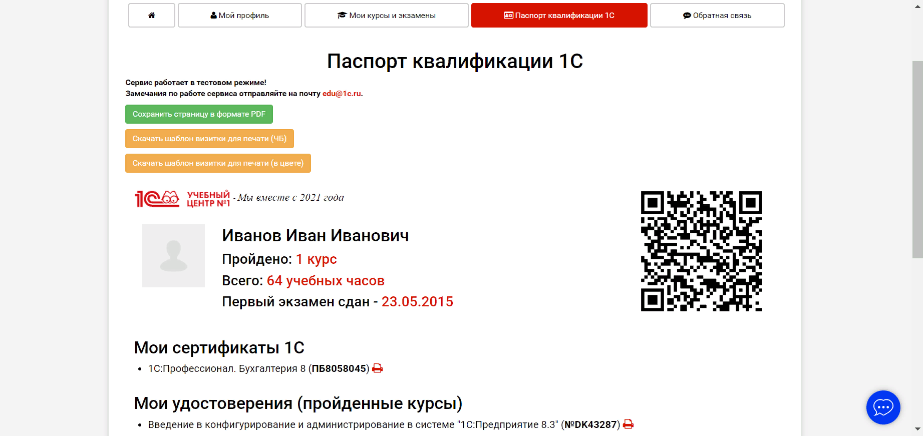 В паспорте 1C есть возможность скачать электронные версии удостоверений, полученных после прохождения курсов в 1С:Учебном центре №1, а также, сертификатов 1С:Профессионал, 1С:Специалист и 1С:Специалист-консультант